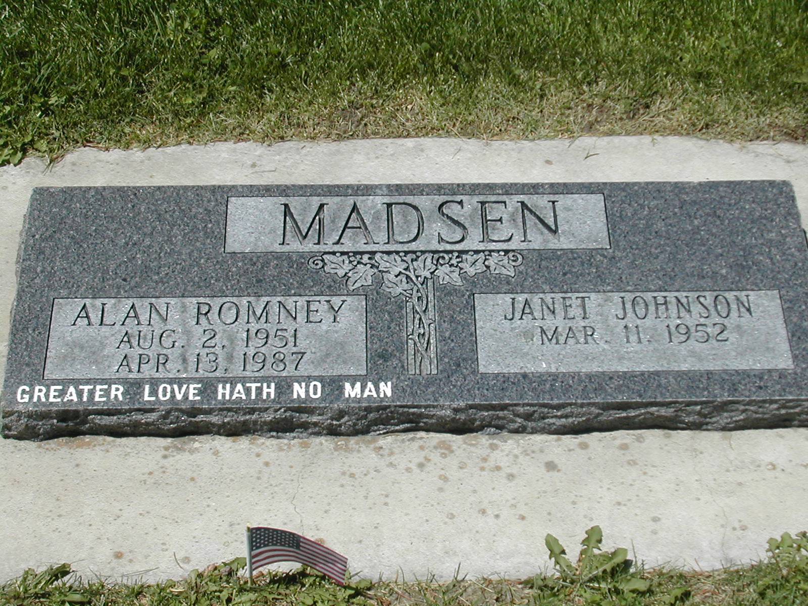 #2) Alan Romney Madsen, born 2 Aug 1951, Oakland, Alameda Co., Calif. Died 13 April 1987 in Garland, Box Elder County. He is also buried in Brigham City Cemetery plot B-26-15-6W. Alan Married Janet Johnson ,